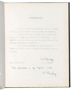Nel lotto che presenta i suoi lavori scientifici spicca la sua la sua tesi di dottorato sull’origine dell’Universo (foto sopra), che lo scienziato discusse nel 1965 all’Università di Cambridge, scritta a macchina dalla prima moglie Jane Wilde, con alcune formule scritte a mano dallo stesso autore. Valore iniziale, 126mila dollari.