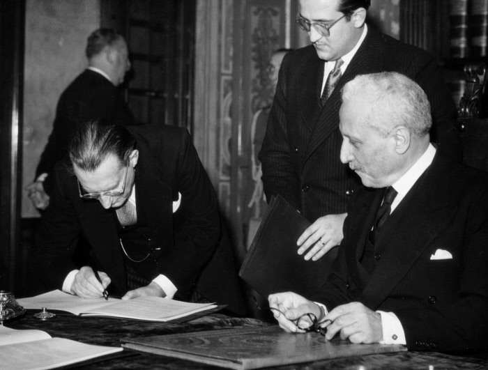Alcide De Gasperi firma la Carta. A destra Enrico De Nicola