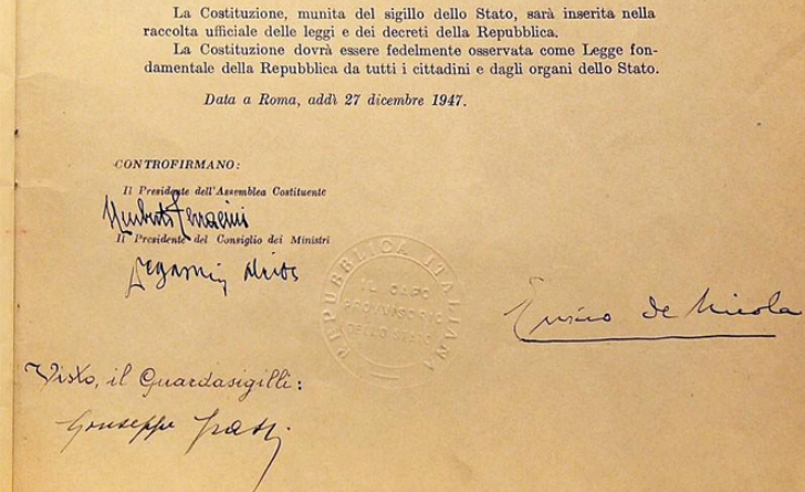 È entrata in vigore il 1° gennaio del 1948, ma per tutti, il 70° compleanno della Costituzione italiana, ricorre il 27 dicembre 2017, giorno in cui il presidente provvisorio dello Stato Enrico De Nicola (nella foto a lato), firmò il testo.