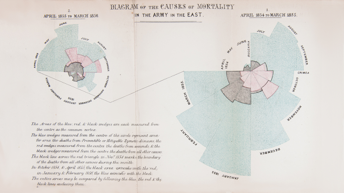 Come dimostra il caso di studio dell’operatrice sanitaria britannica Florence Nightingale, fondatrice dell’assistenza infermieristica con tanto di scuola e la cui comunicazione visiva in campo medico, sia stata fautrice di significative azioni legislativi nella cura del malato.
