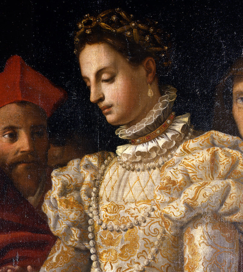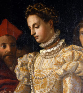 Immagini: 1) particolare del dipinto ‘Matrimonio di Caterina de Medici’ di Jacopo Chimenti detto Empoli- Galleria degli Uffizi – Firenze; 2) Maria Grazia Chiuri, direttrice artistica della Maison Dior; 3) sfilata Dior, stagione primavera-estate 2023, ispirata a Caterina de’Medici- photo by Facebook – Dior