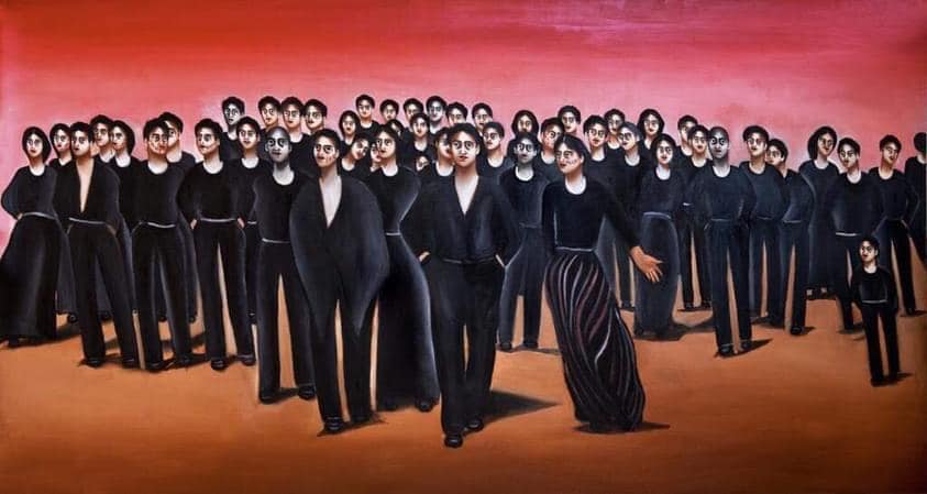 Una pluralità alla quale Luca Sacchetti dà forma attraverso il riadattamento del simbolo artistico per eccellenza dell’universalità, Il Quarto Sato di Giuseppe Pellizza da Volpedo, che qui diventa Il Sesto Stato, a sottolineare, e suggellare che soltanto insieme riusciamo a tornare interi.
