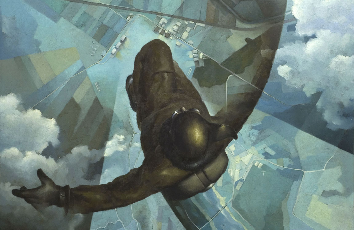 L’aereo, per molti in quegli anni, è il simbolo per eccellenza della libertà e del movimento, ed è quel movimento che gli artisti futuristi portano sulla tela, con il suo protagonista assoluto, l’aviatore: tutto il resto perde d’importanza. L’aeropittura vuole trasmettere le emozioni del volo: i sentimenti e le sensazioni che si provano a librarsi nell’aria a grande velocità, sorvolando le città e la natura sottostanti, per poi lanciarsi nel vuoto con il paracadute.  E, così, ecco l’opera di Tullio Crali, Prima che si apra il paracadute (1939), che termina il percorso espositivo di Palazzo Blu come, appunto, il giungere alla fine di un viaggio che inizia con il ritratto del fondatore del Futurismo, Filippo T. Marinetti realizzato dalla pittrice ceca Rougena Zatkovà, esponente dell’avanguardia.
