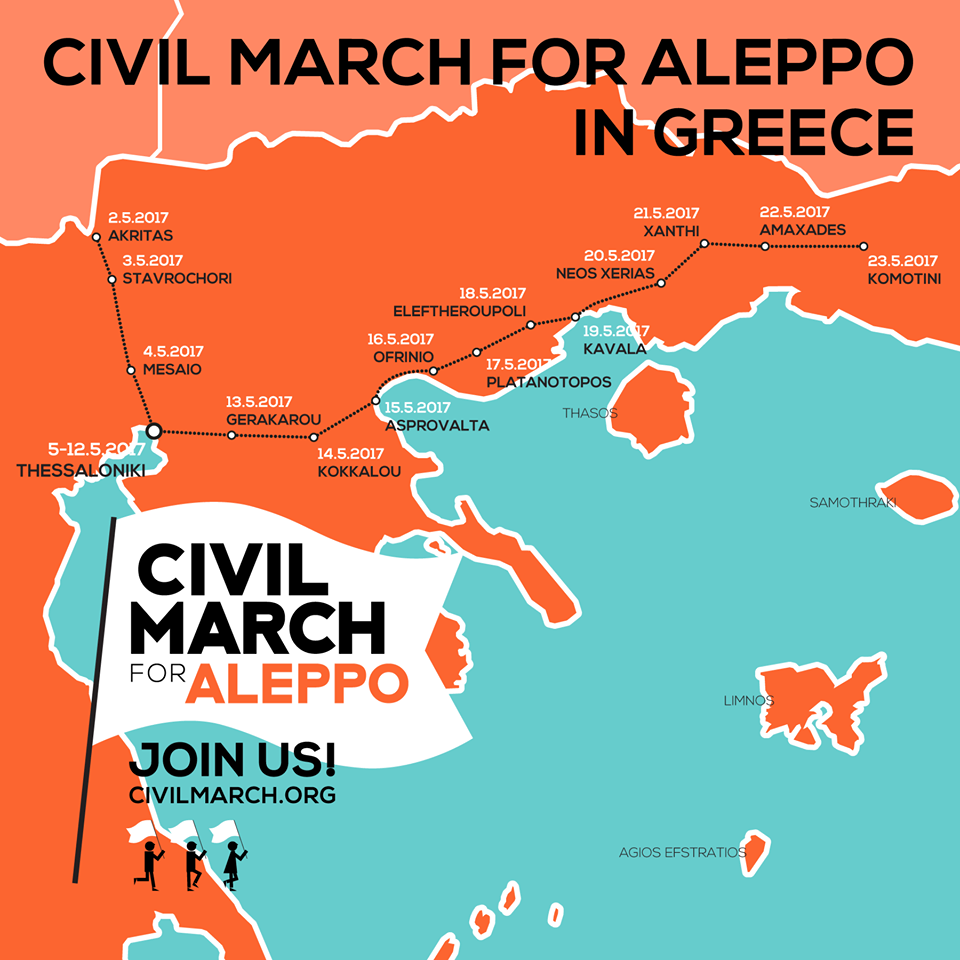 In Grecia 3 maggio 17Nuovo mese, nuova nazione, nuova pagina. Partita da Berlino il 26 dicembre 2016, la Civil March for Aleppo, il primo maggio 2017 è giunta in Grecia, 9° paese del suo lungo cammino.