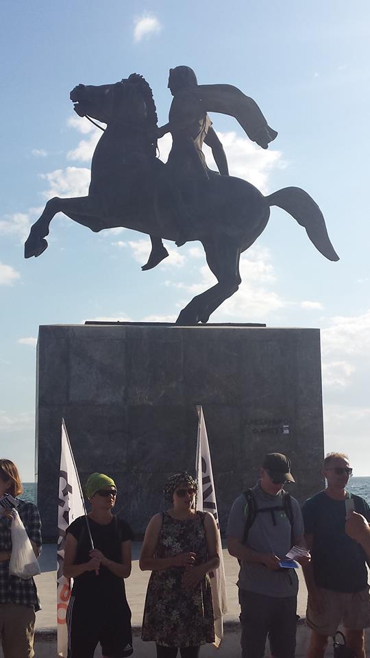 Salonicco 6 maggio StatuaGiunta a Salonicco il 5 maggio, la CMFA ha raggiunto nel pomeriggio la statua di Re Costantino (foto a lato) e ha marciato per le strade della città. Distribuendo volantini di protesta contra la guerra in Siria ha interagito con tante persone, le più disparate, che si sono fermate per il ricevere il messaggio della CMFA, facendosi esempio   di una delle convinzioni e obiettivo della Marcia: sostituire l’ampio spazio del dibattito pubblico riservato al “potere della guerra” con il discorso  della”potenza della pace”.
