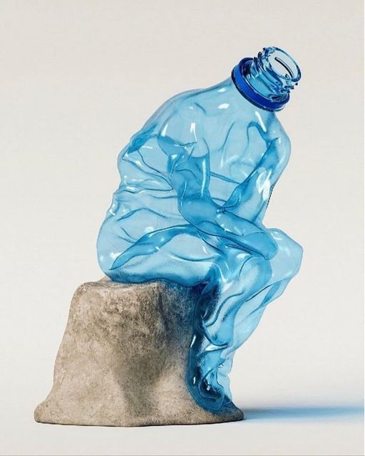 Il pensatore postmoderno si rifà alla celebre statua de Il pensatore dello scultore francese Rodin, ma ad assumere la sua tipica posizione riflessiva non è un corpo umano ma una bottiglia di plastica, senza testa, senza mani e senza piedi.