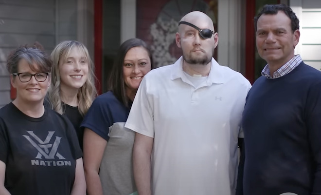 Immagine: dopo aver ricevuto un trapianto di occhio intero e di parte del viso, il primo caso di questo tipo al mondo, Aaron James (secondo da destra, accanto al dottor Rodriguez, a capo dell’ équipe di 140 chirurghi impegnati nell’intervento ) sta ottenendo una seconda possibilità di vita dopo un grave incidente elettrico ad alto voltaggio – photo by STAFF NYU LANGONE
